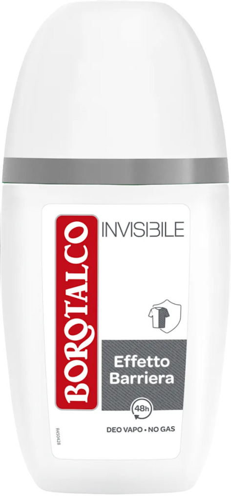 Invisible: antimacchie gialle e bianche. Il deodorante Borotalco Invisible è il nuovo deodorante studiato per ridurre le macchie gialle sui tessuti chiari e i residui bianche sui tessuti scuri. Grazie alla sua formula con microtalco che assorbe il sudore, regola la traspirazione e lascia la pelle più asciutta per tutto il giorno.
