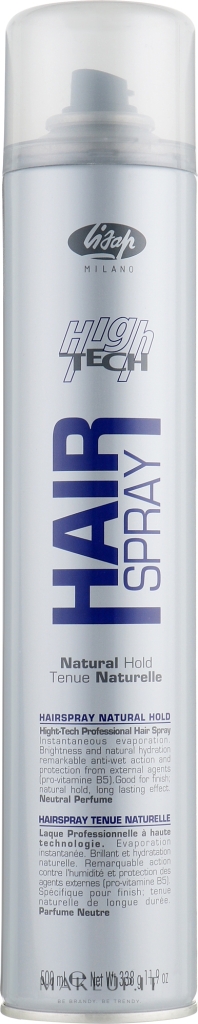 De High Tech Hair Spray Natural van Lisap is een prachtige hairspray die je haar laat glanzen en tegelijkertijd ook hydrateert. Deze haarlak verstevigt het haar en geeft direct meer volume. Verrijkt met de nieuwe generatie High Tech polymeren