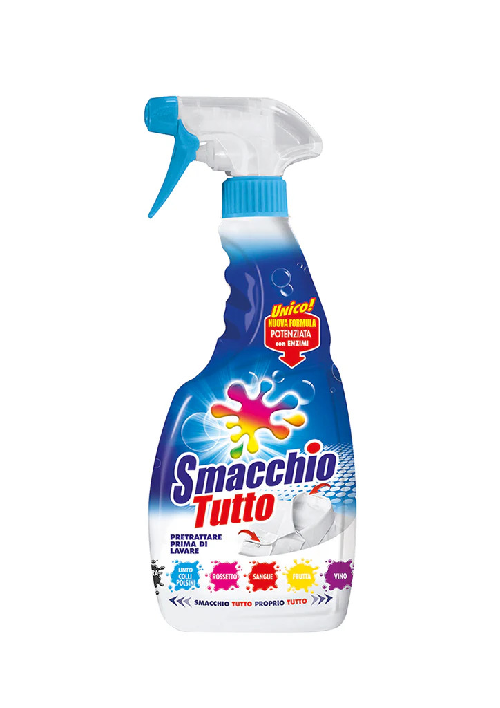 Smacchio Tutto è efficace su Biro, Inchiostro, Evidenziatore, Erba, Morchia, Unto di colli e polsini, Sangue, Sugo, Caffè, Cioccolato, Frutta, Vino, Rossetto, Matita e Mascara per occhi, Cipria e Ombretto. Si usa prima di lavare. E' un pretrattante efficace su tutti i tipi di macchie, perché è potenziato con enzimi. Grazie alla sua comoda confezione dotata di spazzolina erogatrice, è pratico e facile da usare.